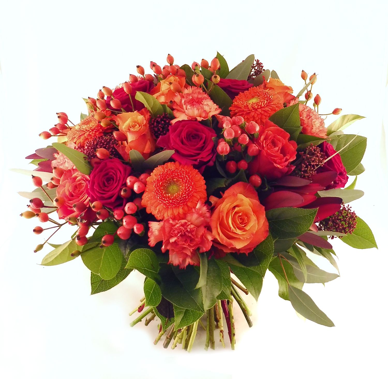 Handgebonden boeket met enkel bloemenin verschillende tinten oranje, rood en groen.